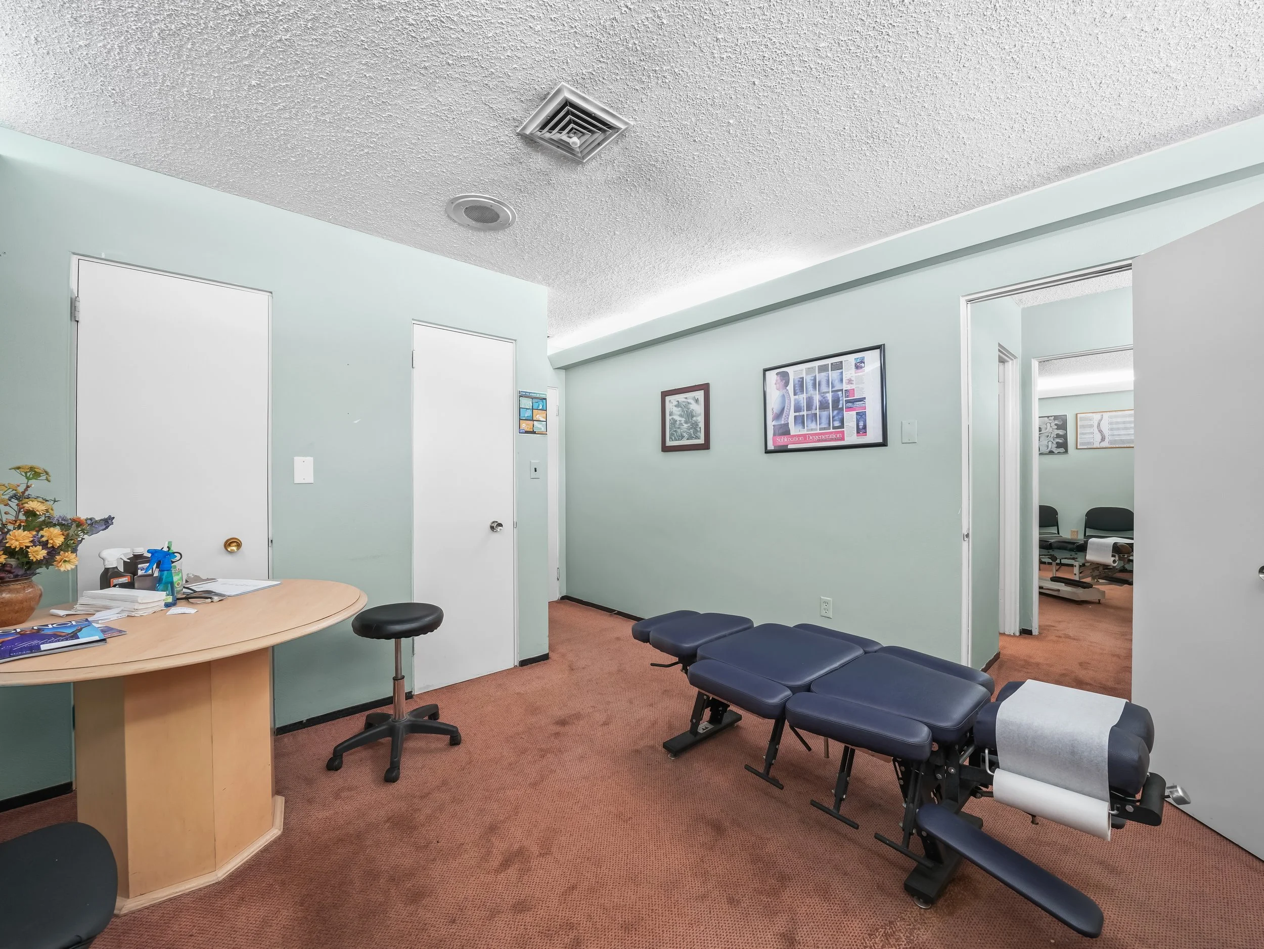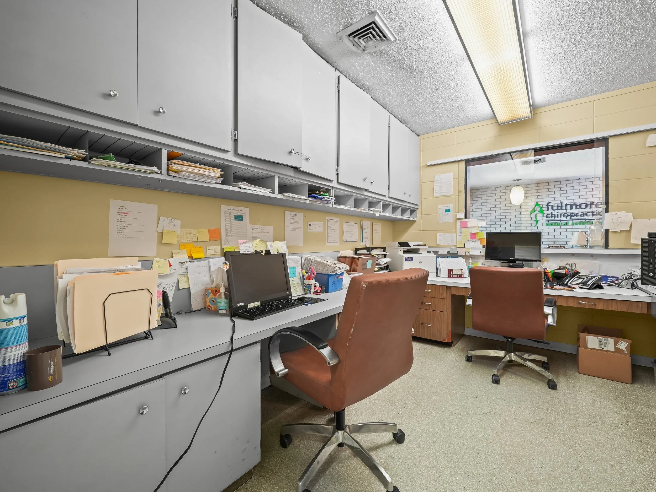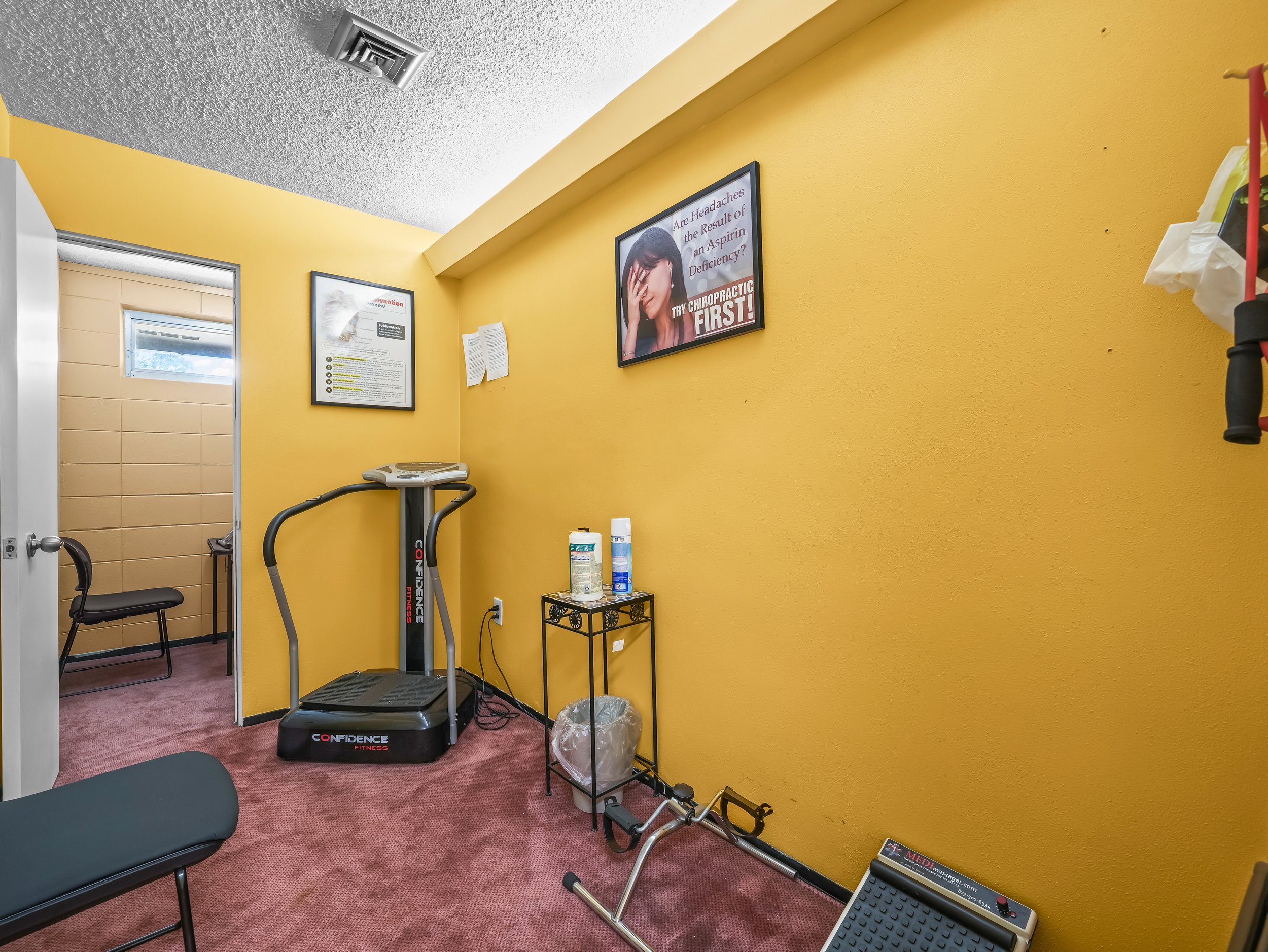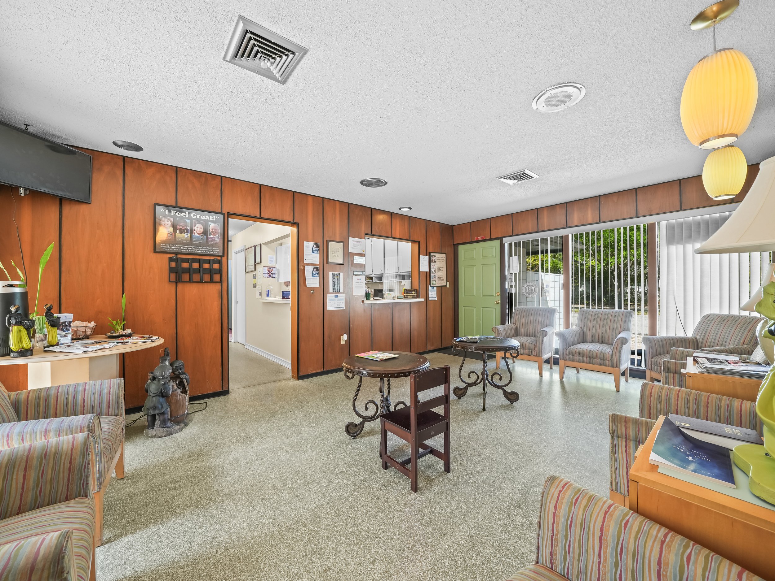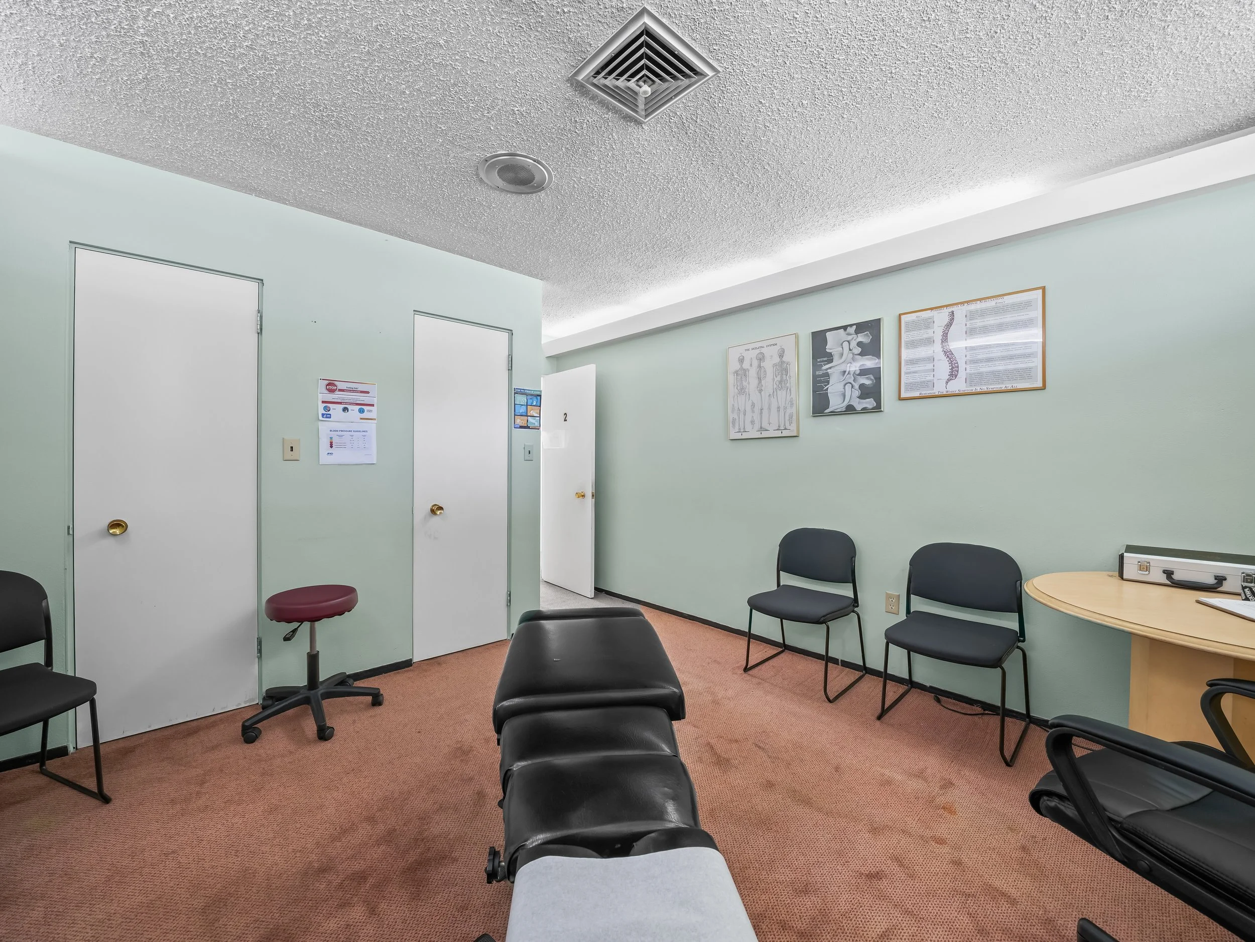 1 patient reception area 2 bathrooms (1 in the front of the office by the reception area and one in the back by the rear entrance and doctor’s office)